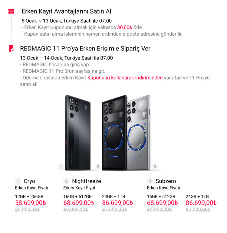 1. Her kupon yalnızca bir adet REDMAGIC 11 Pro satın alımında kullanılabilir.